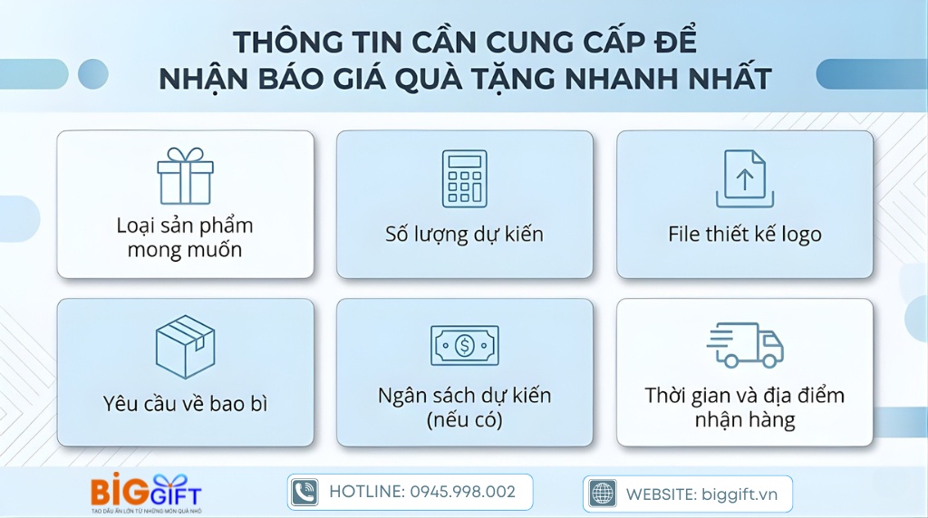 Để BigGift có thể gửi bạn một báo giá chính xác và nhanh chóng, việc cung cấp thông tin chi tiết ngay từ đầu là vô cùng cần thiết. Trước khi gửi yêu cầu, hãy đảm bảo bạn đã chuẩn bị: