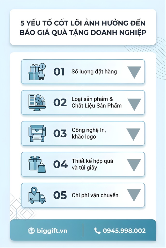 Báo giá quà tặng doanh nghiệp phụ thuộc vào 5 yếu tố cốt lõi bao gồm: Số lượng đặt hàng; Loại sản phẩm & Chất liệu; Công nghệ in, khắc logo; Thiết kế bao bì & hộp quà và Chi phí vận chuyển.