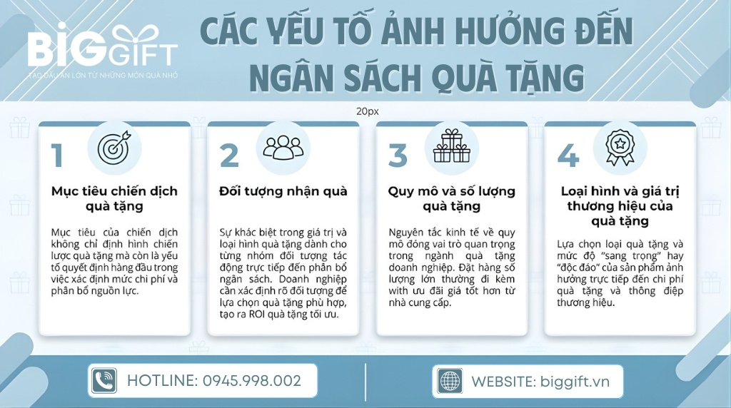 Các hạng mục chi phí cần xem xét bao gồm: chi phí sản phẩm quà tặng, chi phí in ấn/khắc logo thương hiệu, chi phí đóng gói, chi phí vận chuyển, và một khoản dự phòng (thường là 5-10% tổng ngân sách).