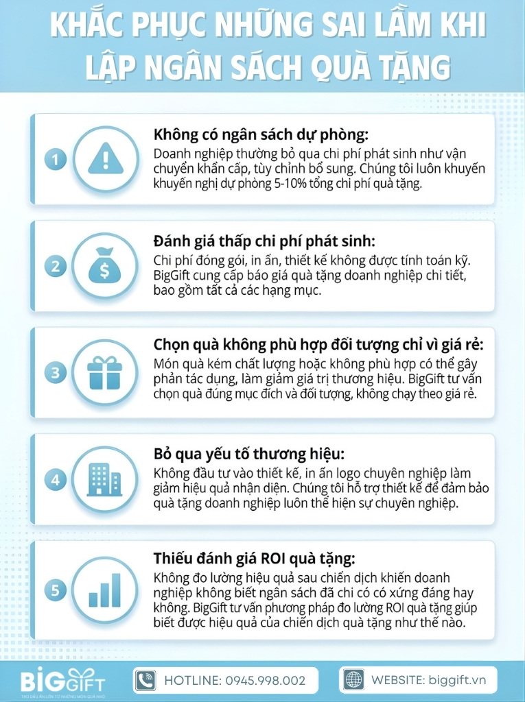 - Không có ngân sách dự phòng: Doanh nghiệp thường bỏ qua chi phí phát sinh như vận chuyển khẩn cấp, tùy chỉnh bổ sung. Chúng tôi luôn khuyến nghị dự phòng 5-10% tổng chi phí quà tặng.