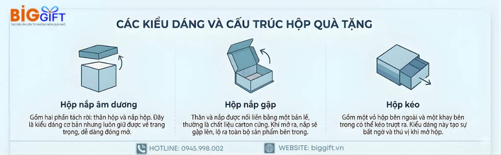 Hiện nay, có 3 kiểu dáng hộp quà phổ biến là hộp nắp âm dương, hộp nắp gập và hộp kéo. Sự khác biệt giữa các kiểu dáng hộp quà này nằm ở cơ chế mở đóng và cách trưng bày sản phẩm.