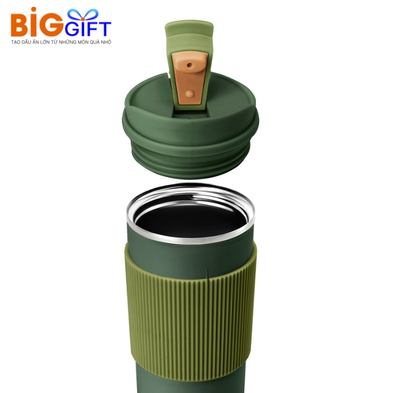 - Vỏ bọc silicon chống trượt thông minh: Thân cốc được trang bị một vòng bọc silicon màu xanh rêu có gân nổi, tạo điểm nhấn thẩm mỹ. Vòng bọc này tăng cường độ bám, giúp cầm nắm chắc chắn. Phần đáy cốc cũng được trang bị lớp silicon tương tự, giúp cốc đứng vững trên mọi bề mặt, hạn chế đổ vỡ.