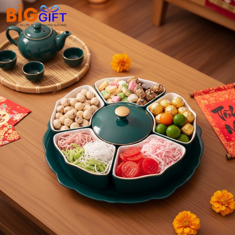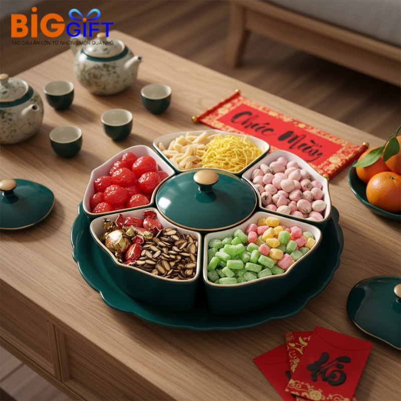 - Số lượng ngăn chứa tiện lợi: Bộ khay mứt gồm 5 ngăn riêng biệt và một ngăn trung tâm, tổng cộng 6 ngăn, giúp dễ dàng phân loại và bày trí đa dạng các loại mứt, kẹo, hạt. Sự sắp đặt này mang đến sự thịnh soạn và phong phú cho bàn trà ngày Tết.