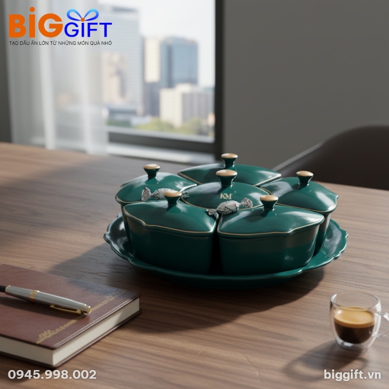 Khay mứt sứ quà tặng in logo dáng 5 cánh hoa men xanh cổ vịt KM03 là một giải pháp quà tặng Tết cao cấp, gây ấn tượng mạnh mẽ với vẻ ngoài sang trọng. Màu men xanh cổ vịt sâu lắng, kết hợp với các chi tiết núm vàng đồng của bộ khay mứt tạo nên một tặng phẩm đẳng cấp, thể hiện sự đầu tư chỉn chu của doanh nghiệp.