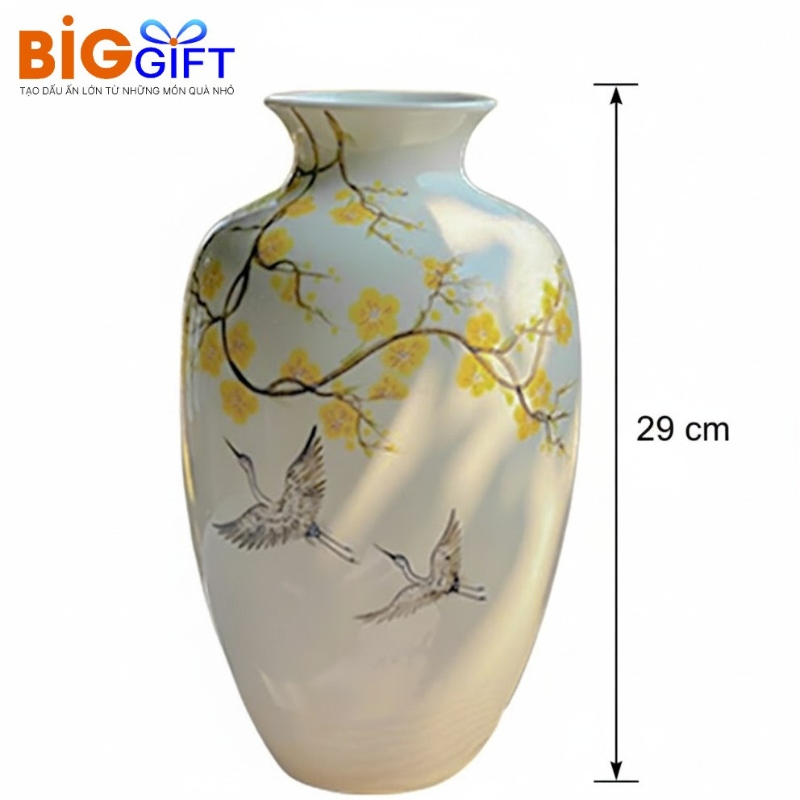 Lọ hoa gốm sứ quà tặng dáng béo chim hạc hoa mai 29cm LHGS04 là một tác phẩm nghệ thuật, hội tụ hai biểu tượng cao quý của văn hóa Á Đông. Họa tiết chim hạc biểu tượng của sự trường thọ, bền bỉ kết hợp với hoa mai mùa xuân mang đến tài lộc, may mắn tạo nên một lời chúc phúc sâu sắc về sự thịnh vượng bền vững và cao quý.