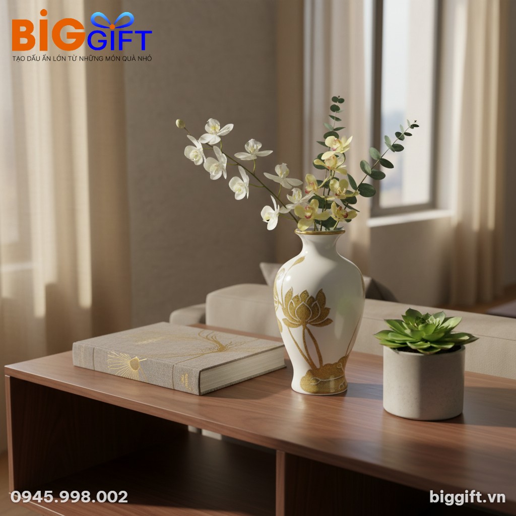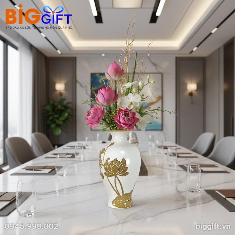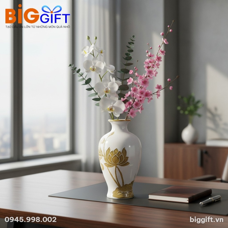 Với họa tiết hoa sen gấm vàng được thể hiện tinh xảo trên nền men sứ trắng, bình hoa gốm sứ quà tặng trở thành biểu tượng cho sự thanh khiết, phát triển bền vững và một hành trình thịnh vượng. Đây là lựa chọn hoàn hảo để thể hiện sự tôn trọng đến các đối tác chiến lược, lãnh đạo cấp cao và vinh danh nhân viên có thành tích xuất sắc.
