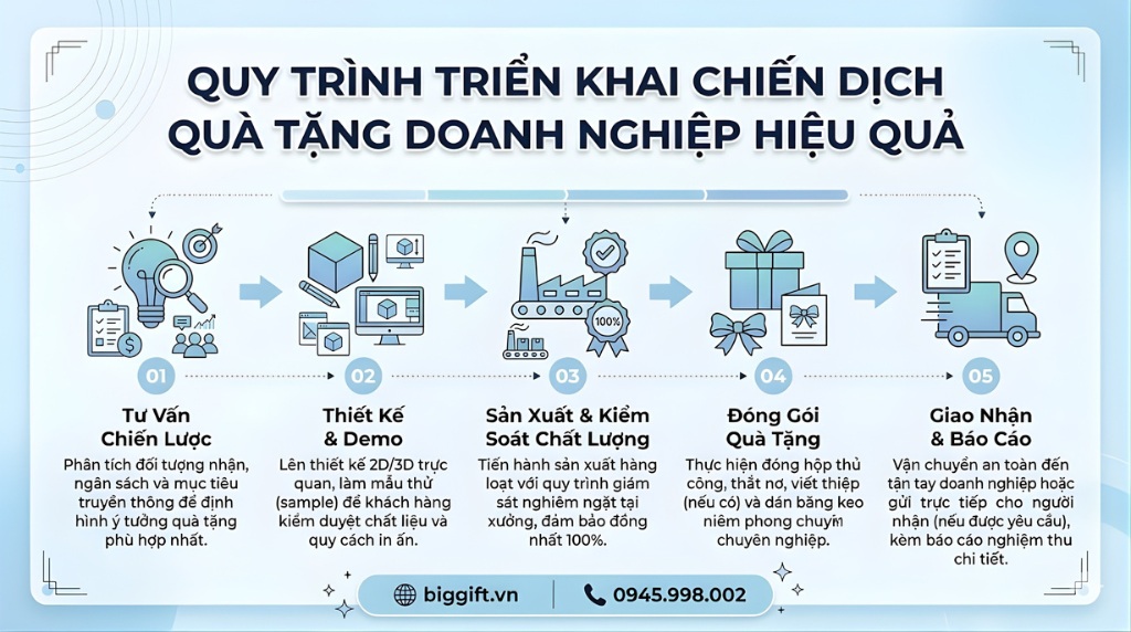 BigGift khuyến nghị quy trình lập kế hoạch quà tặng sớm, bao gồm các bước tư vấn chuyên sâu, thiết kế sáng tạo, duyệt mẫu kỹ lưỡng, sản xuất và giao hàng đúng hẹn.